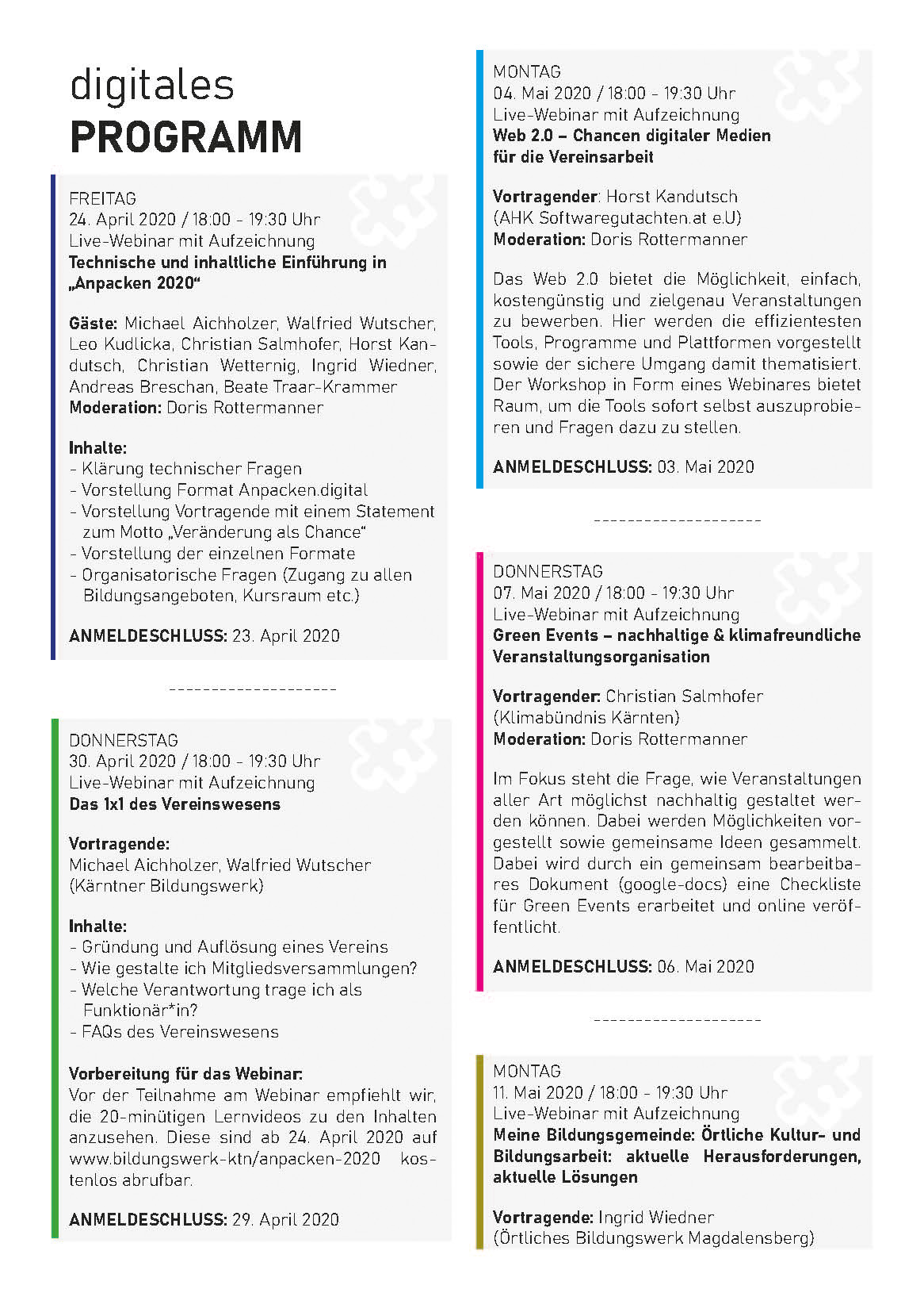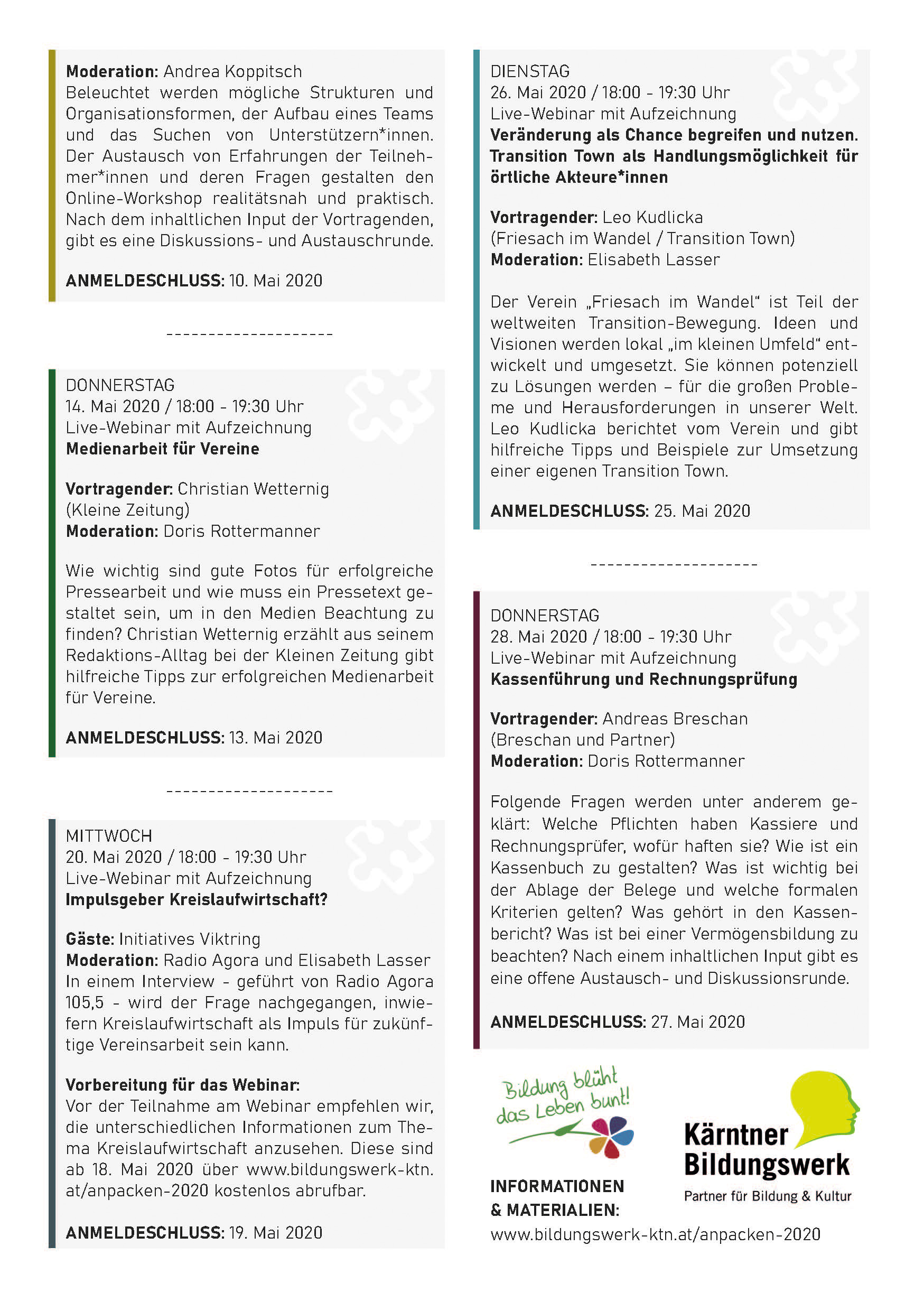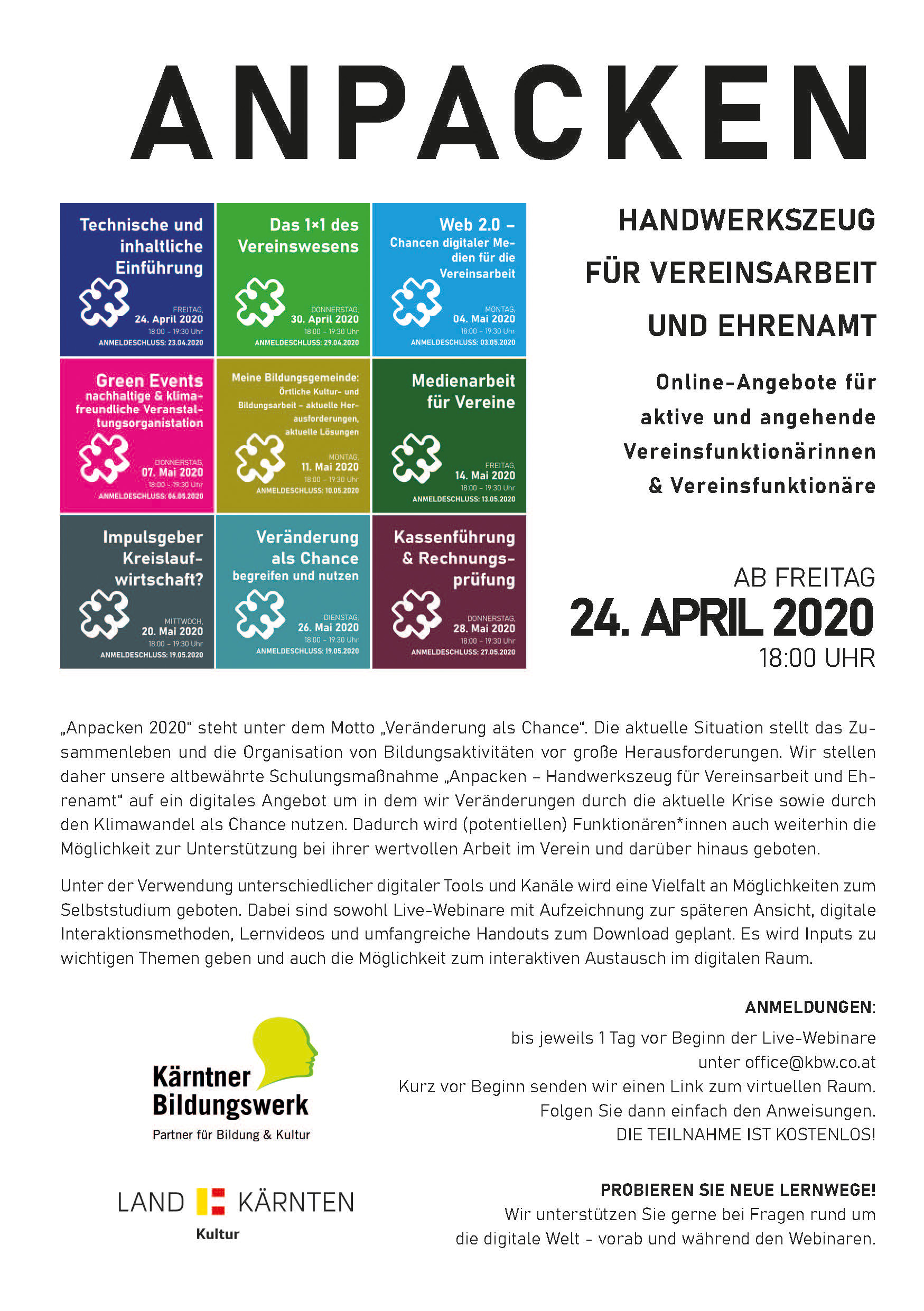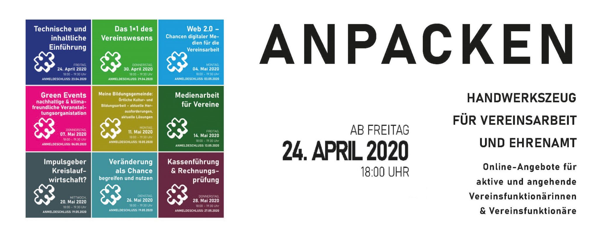 „Anpacken 2020“ steht unter dem Motto „Veränderung als Chance“. Die aktuelle Situation stellt das Zusammenleben und die Organisation von Bildungsaktivitäten vor große Herausforderungen. Wir stellen daher unsere altbewährte Schulungsmaßnahme „Anpacken – Handwerkszeug für Vereinsarbeit und Ehrenamt“ auf ein digitales Angebot um in dem wir Veränderungen durch die aktuelle Krise sowie durch den Klimawandel als Chance nutzen. Dadurch wird (potentiellen) Funktionären*innen auch weiterhin die Möglichkeit zur Unterstützung bei ihrer wertvollen Arbeit im Verein und darüber hinaus geboten.