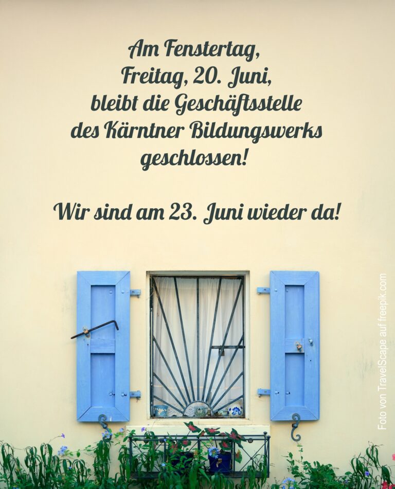 Sommerzeit im Kärntner Bildungswerk Geschäftsstelle von 04. bis 14. August geschlossen! Individuelle Urlaubszeiten: Michael Aichholzer: 28.07- 14.08Doris Rottermanner: 28.07- 20.08Andrea Koppitsch & Claudia Schwarz: 04. – 22.08 Gerne schicken Sie in der Zwischenzeit wie gewohnt Ihre Anliegen oder Beiträge für den…