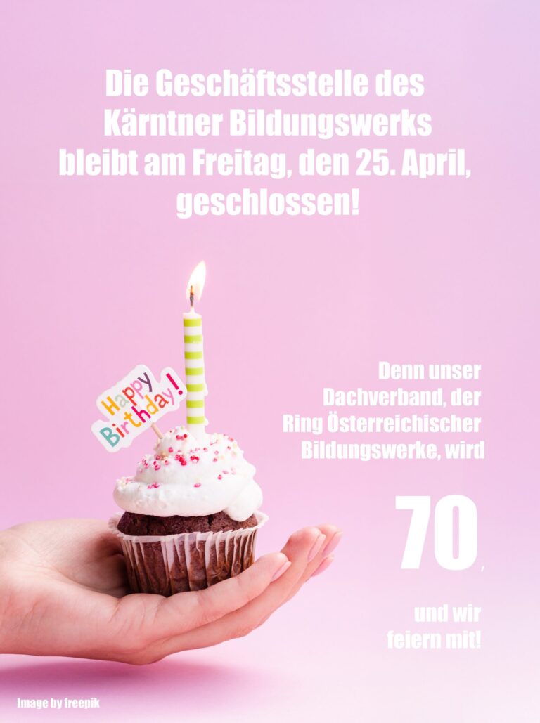 Geschäftsstelle am 25.04 geschlossen Die Geschäftsstelle des Kärntner Bildungswerks bleibt am Freitag, den 25. April, geschlossen! Denn unser Dachverband, der Ring Österreichischer Bildungswerke, wird 70, und wir feiern mit! Ab Montag, 28. April, sind wir wieder für Sie da!