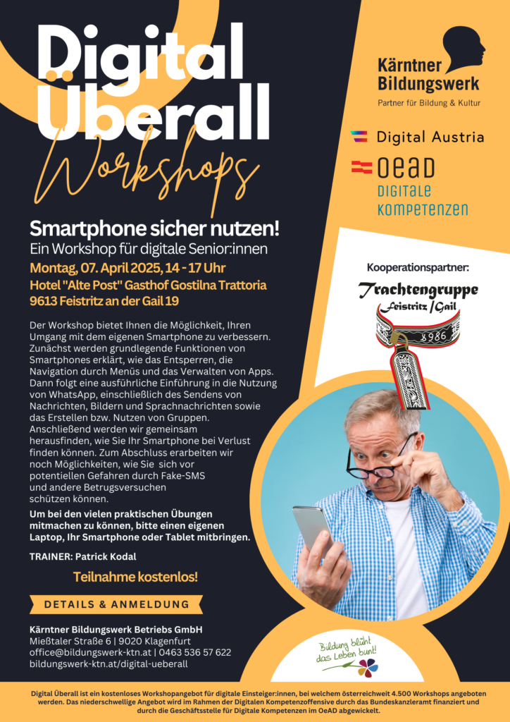 Digital Überall ist ein kostenloses Workshopangebot für digitale Einsteiger:innen, bei welchem österreichweit 4.500 Workshops angeboten werden. Das niederschwellige Angebot wird im Rahmen der Digitalen Kompetenzoffensive durch das Bundeskanzleramt finanziert und durch die Geschäftsstelle für Digitale Kompetenzen im OeAD abgewickelt.