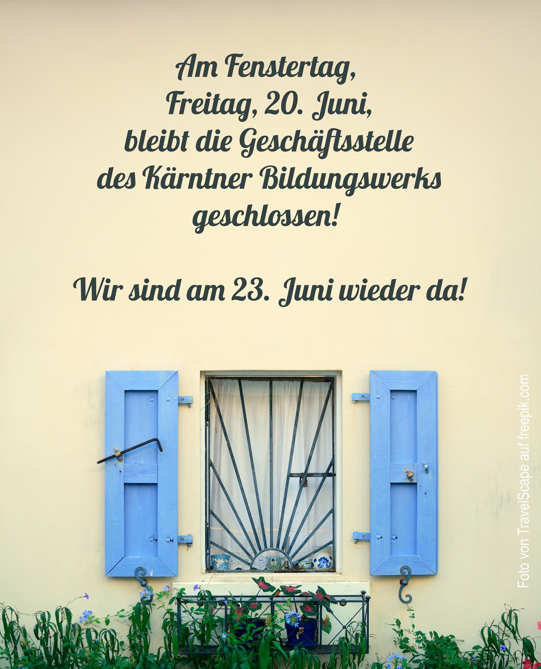 Am Fenstertag, Freitag, 20. Juni, bleibt die Geschäftsstelle des Kärntner Bildungswerks geschlossen!