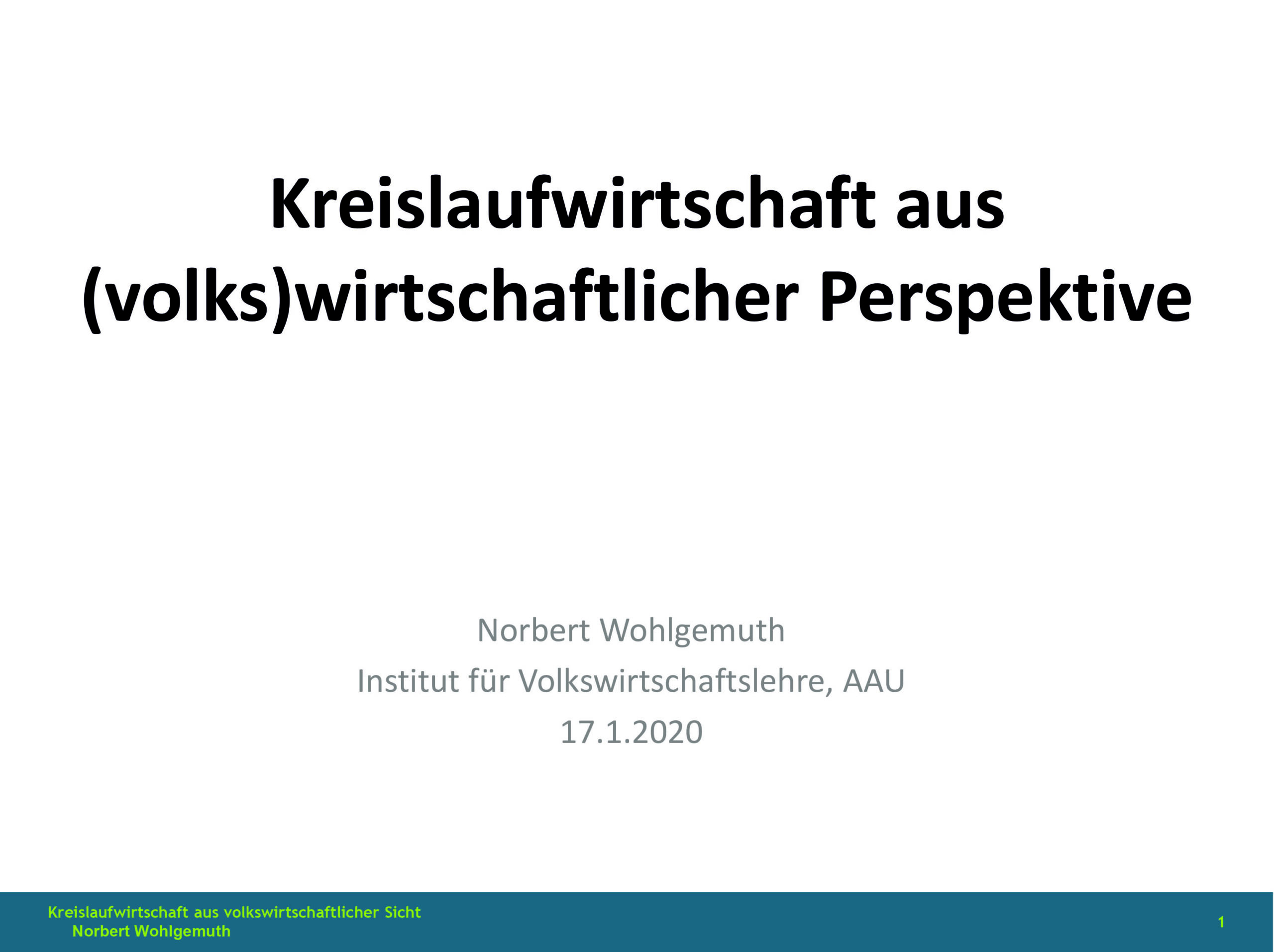 Am 17. Jänner 2020 fand im Gemeindezentrum Viktring, in Kooperation mit „Initiatives Viktring“, die Veranstaltung „Zukunft Kreislaufwirtschaft“ statt. Dort referierte unter anderen Dr. Nobert Wohlgemuth vom Institut für Volkswirtschaftslehre der Universität Klagenfurt. Er gab Einblicke zum Themenbereich „Kreislaufwirtschaft aus (volks)wirtschaftlicher Perspektive“. Seine Präsentation stellen wir hiermit zum Nachlesen zur Verfügung.